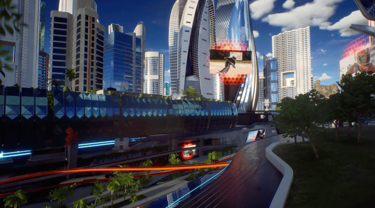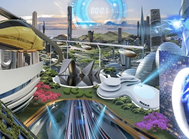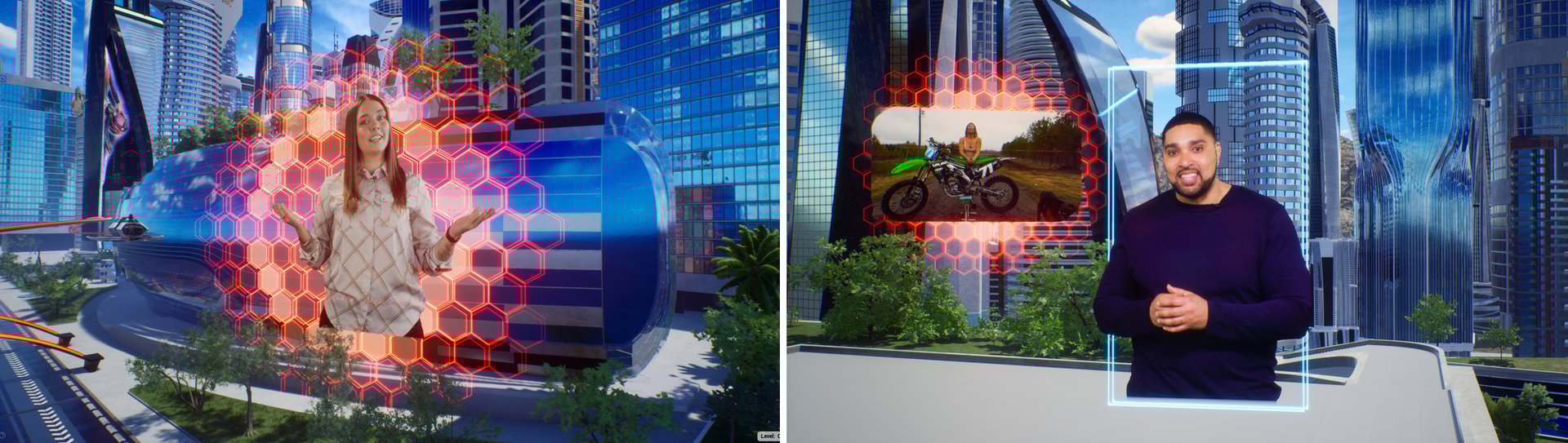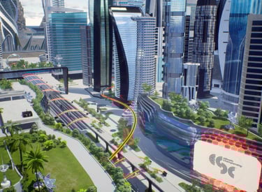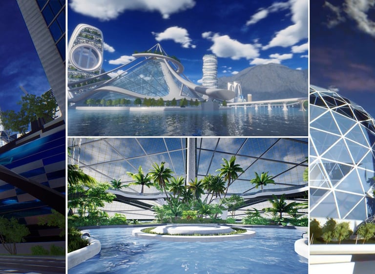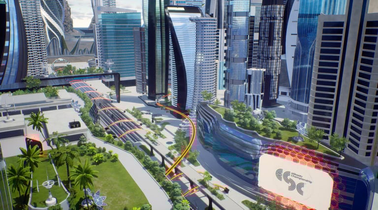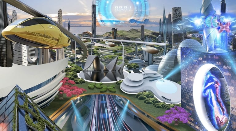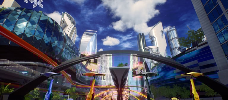La creación de nuestro metaverso sostenible, la "Ciudad Cyber-Eléctrica", inspirada en la visión futurista de los fundadores de eSC, fue un reto apasionante. Con elementos arquitectónicos, abundantes parques verdes y un futuro no tan lejano, este entorno XR incorpora trenes, autos y scooters eléctricos ecológicos.Enfocados en el renderizado en tiempo real para producciones en vivo, esta ciudad virtual actúa como núcleo del metaverso, albergando talento, patrocinadores, gráficos y contenidos audiovisuales.