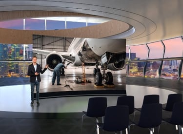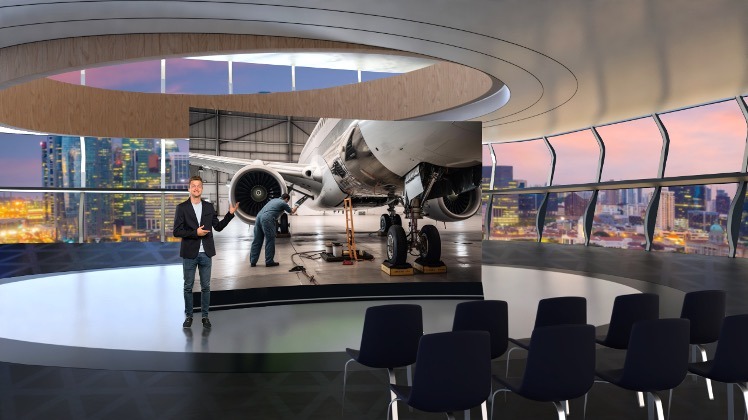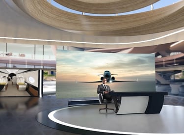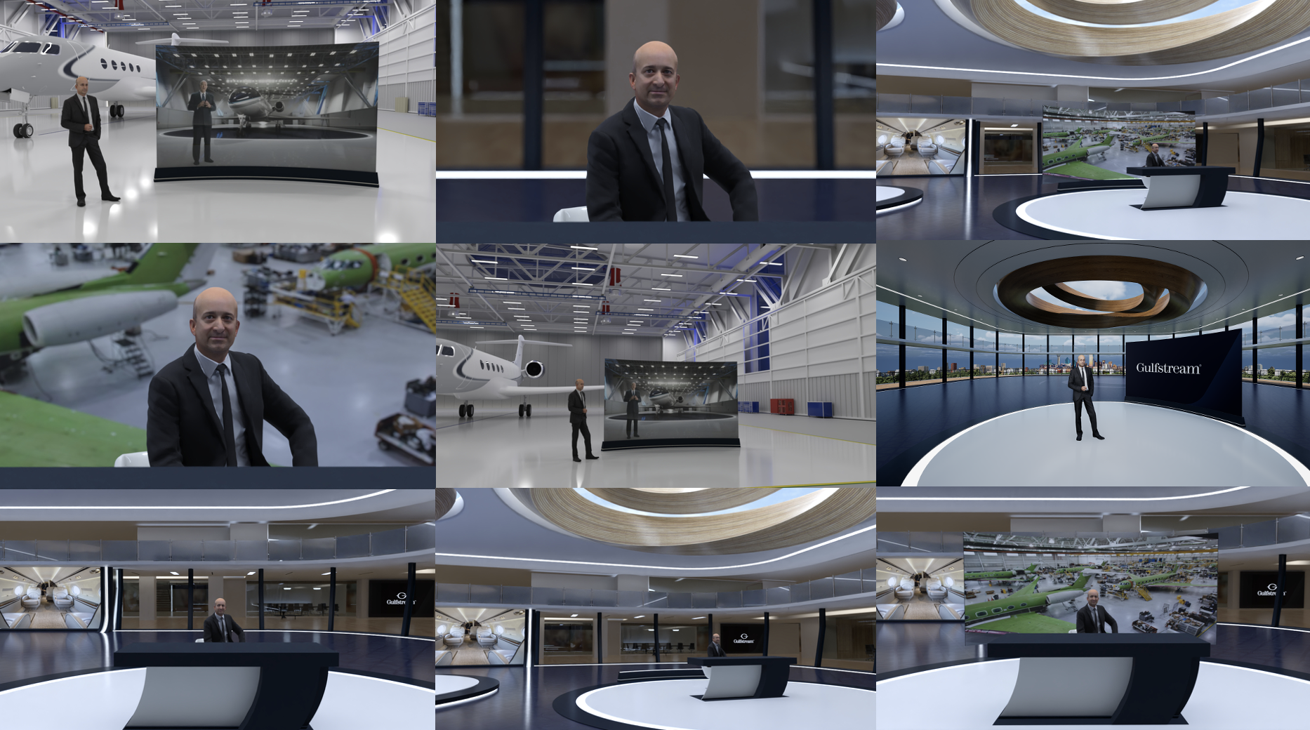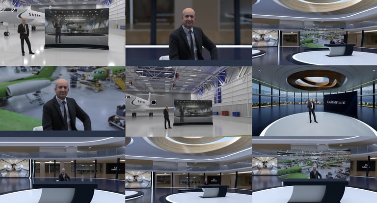 Gulfstream Aerospace, con base en Savannah, Georgia, buscaba personalizar sus segmentos de debate en foros regionales más allá de un set virtual estándar. Con esta premisa en mente, diseñé una variedad de escenarios virtuales para respaldar tanto el servicio al cliente como los contenidos de soporte técnico. Se conceptualizó e incorporó un paisaje exterior reutilizable por los equipos de Gulfstream, con posibilidad de modificaciones dinámicas en Reality HUB. Este enfoque visual genera un diseño sutil pero unificado que integra a especialistas en la materia con los contenidos específicos de cada región.