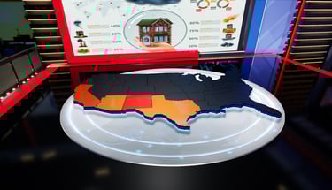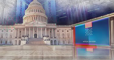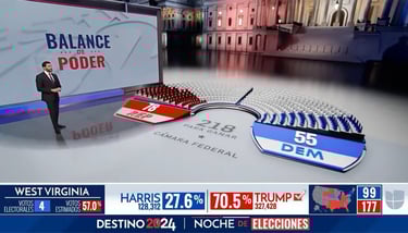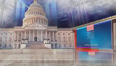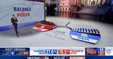 Una vez implementadas las diferentes piezas gráficas de Realidad Aumentada, el desafío era la recreación digital del Capitolio de EE.UU., usando modelado 3D y renderizado en tiempo real para un set virtual inmersivo. Este se integró en un espacio de 360 grados, con la pantalla física como elemento híbrido para superposiciones seamless, facilitando gráficos de resultados electorales como distribuciones de asientos en el Congreso, proyecciones estatales y alertas clave, sincronizados con datos en tiempo real de fuentes oficiales.